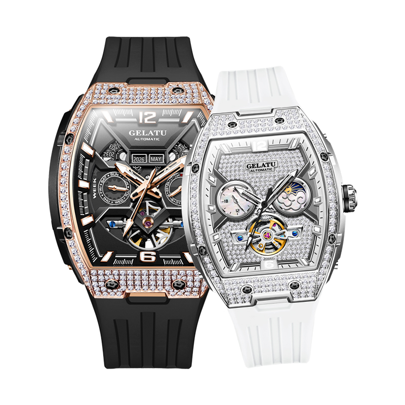 潮酷领航×柔雅格调 双生酒桶镶钻机械对表